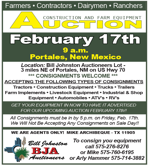 Calling all Farmers, Contractors, Dairyment, and Ranchers! Get ready for the ultimate Construction and Farm Equipment Auction on February 17 at 9 am in Portales, New Mexico. The auction will be held at the Bill Johnson Auctioneers Log, just 3 miles NE of Portales on HWy 70. This is your opportunity to buy and sell top-quality equipment. We welcome consignments of tractors, construction equipment, trucks, trailers, farm implements, livestock equipment, industrial and shop equipment, automobiles, ATVs, and RVs. Consign now to ensure your equipment is advertised for our upcoming auction on February 17. All consignments must be in by 5 pm on Friday, February 17 – please note that we will not be accepting any consignments on sale day! Act now to secure your spot – we are agents only! For consignments and inquiries, contact Mike Archibeque at Tx 11905. To consign your equipment, call 575-276-8276. Don't miss out on this fantastic opportunity to be part of a high-quality auction. Bill Johnston Auctioneers – where your equipment meets its match!