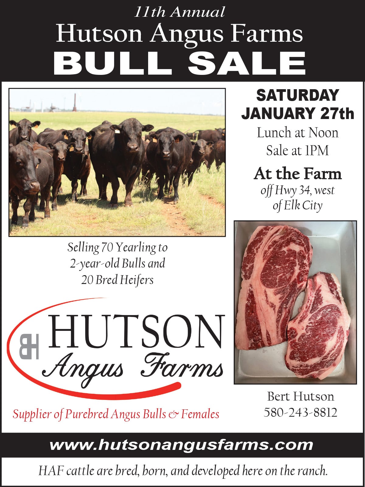 For inquiries about the Bull Sale or more information, contact Bert Hutson at 580-243-8812. You can also visit the official website at www.hutsonangusfarms.com for additional details.
