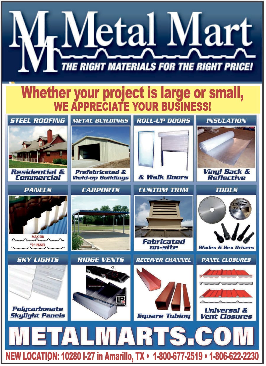 Are you looking for high-quality metal building products and tools at the right price? Look no further than Metal Mart! Our Amarillo location on I-27 Canyon offers a wide range of products, including metal carports, commercial and residential buildings, skylights, roll-up doors, channel vents, receivers, and more. Whether your project is large or small, we have the right materials to get the job done. Our steel roofing is perfect for both residential and commercial buildings, and we offer prefabricated and weld-up buildings to suit your needs. We also offer insulation, vinyl back and reflective panels, carports, custom trim, and more. And with our on-site fabrication, you can be sure that you’re getting the best possible service. At Metal Mart, we appreciate your business, no matter how big or small your project may be. That’s why we offer flexible options and reliable service to meet your needs. Call us today at 1-800-677-2519 or visit our website at metalmarts.com to learn more. Metal Mart: the right materials for the right price!