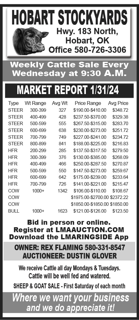 Tune in to Hobart Stockyards for your weekly cattle sale every Wednesday at 9:30 A.M.! Located on Hwy. 183 North in Hobart, OK, our market report for 11/3/24 showcases a range of quality livestock. From steers to heifers, cows to bulls, we've got you covered. With a comprehensive weight range and average prices, you can trust Hobart Stockyards for fair and transparent transactions. Bid in person or online via LMAAUCTION.COM or download the LMARINGSIDE App for easy access. Owned by Rex Flaming, you can reach us at 580-331-8547. Auctioneer Dustin Glover ensures a smooth sale process. Cattle are accepted all day Mondays & Tuesdays, ensuring they're well-fed and watered for auction day. Don't miss our Sheep & Goat Sale on the first Saturday of each month. At Hobart Stockyards, we value your business and appreciate your trust in us!