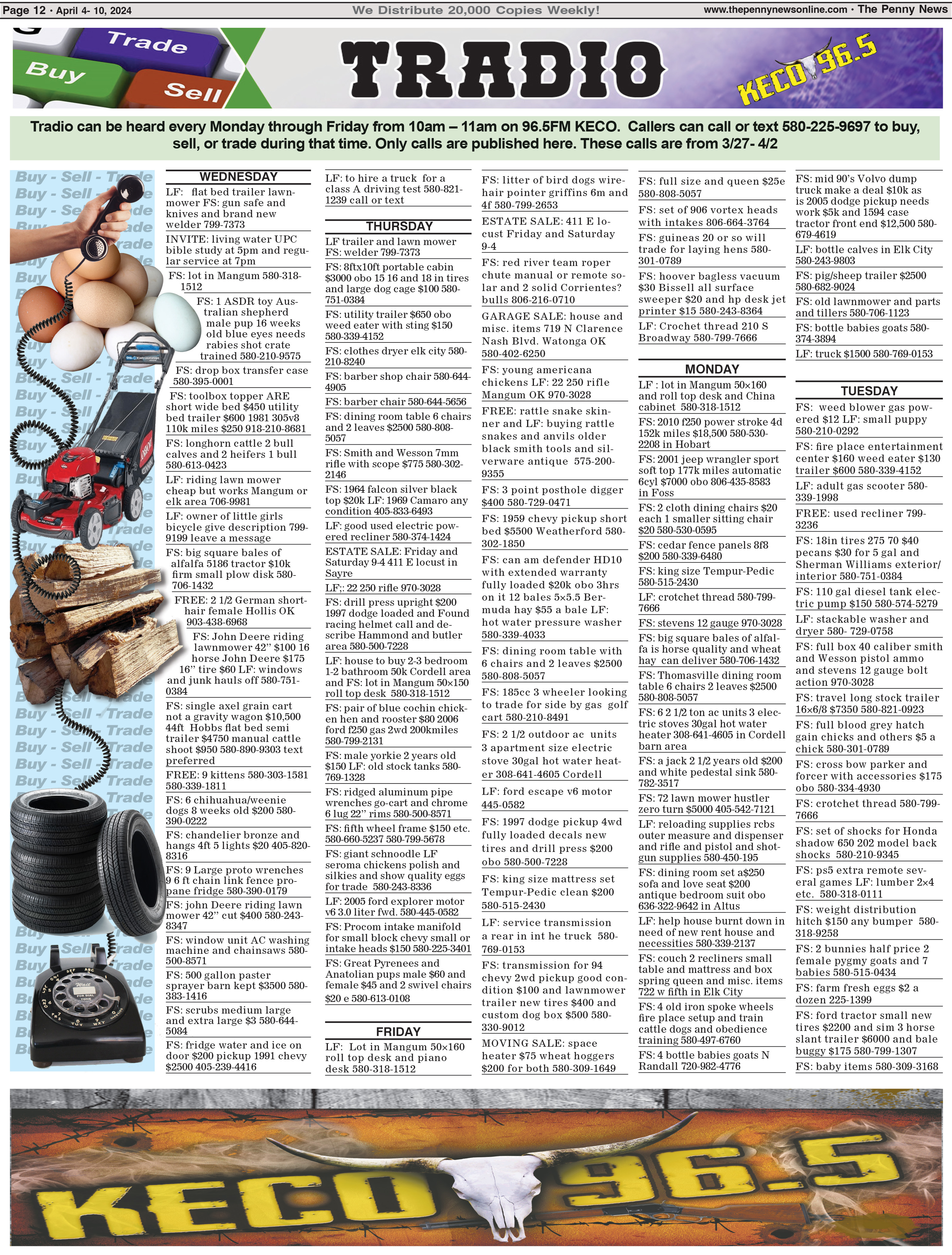 Don't miss out on the latest Tradio listings! Tune in to 96.5FM KECO every Monday through Friday from 10am to 11am to buy, sell, or trade. Call or text 580-225-9697 during the show to participate!
