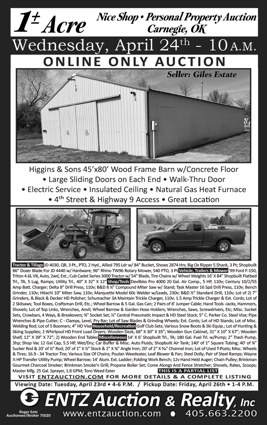 Don't miss out on the opportunity to consign your equipment at the upcoming Equipment Consignment Auction hosted by ENTZ Auction & Reality Inc. The advertising deadline is quickly approaching, so mark your calendars for Monday, April 1st. This auction offers two dates for your convenience: online only on Monday, May 5th, and onsite/online on Tuesday, May 6th. Remember, advertising pays off, and ENTZ Auction & Reality Inc. ensures maximum exposure for your consigned items. Visit entzauction.com or call 405.663.2200 to learn more. Don't wait—turn your equipment into cash at Entz I-40 Auction Facility in Hydro, Oklahoma.