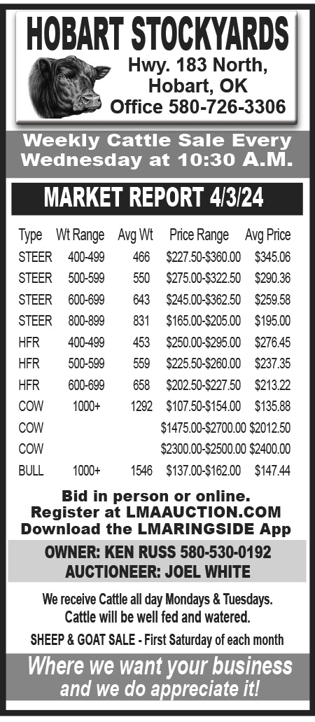Check out Hobart Stockyards for your weekly cattle sale every Wednesday at 9:30 A.M. Located conveniently on Hwy. 183 North in Hobart, OK, our stockyards offer top-quality livestock and competitive prices. Check out our latest market report from 3/20/24 featuring a variety of steers, heifers, cows, and bulls, with prices ranging from $73.00 to $410.00.
