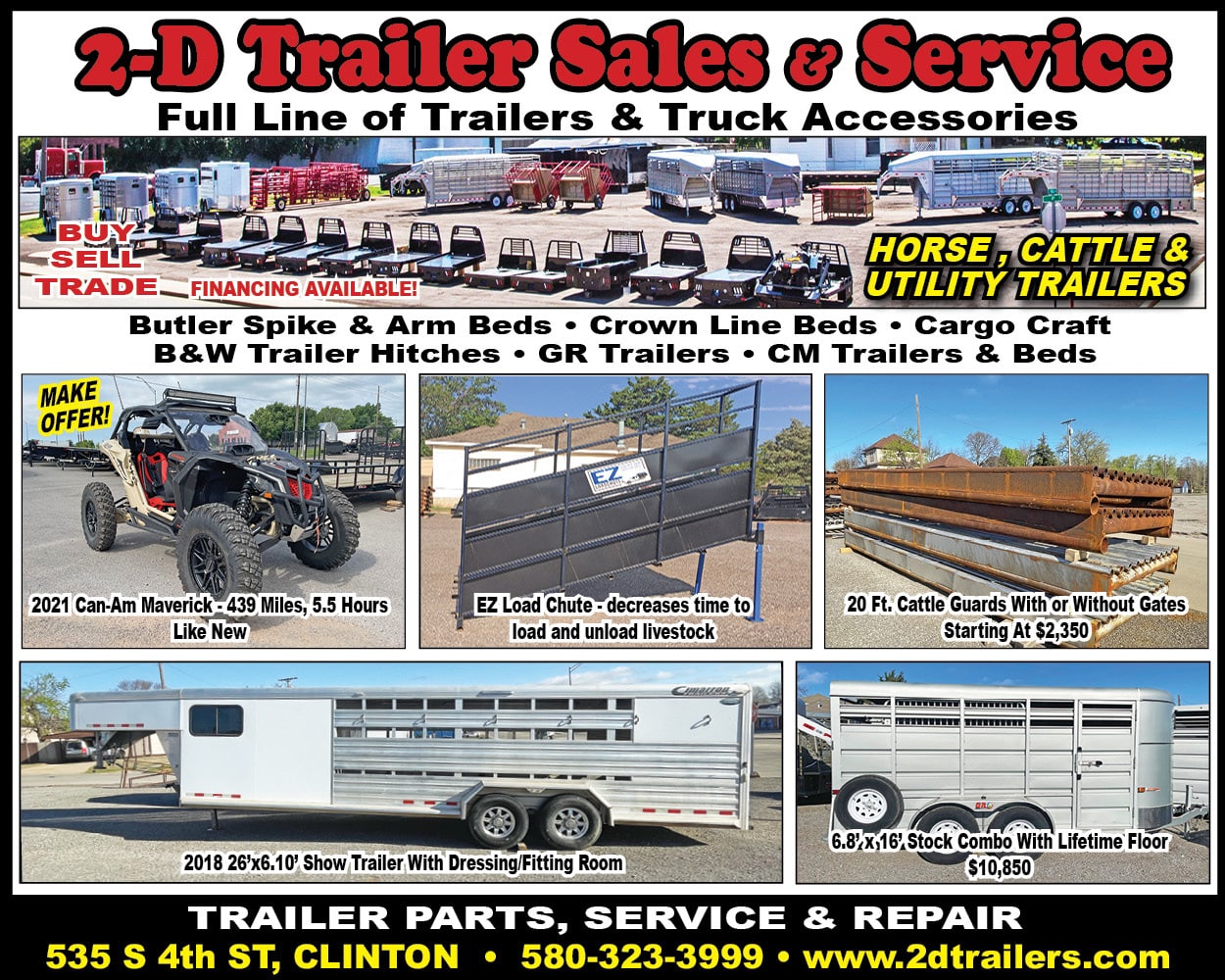Discover top-quality trailers and truck accessories at 2-D Trailers Sales & Service. Whether you need a trailer for hauling livestock or utility purposes, we have you covered with our full line of trailers. From horse and cattle trailers to utility trailers, we offer financing options to suit your needs. Our inventory includes top brands such as Butler Spike & Arm Beds, Crown Line Beds, Cargo Craft, B&W Trailer Hitches, GR Trailers, and CM Trailers & Beds. Make us an offer on our 2021 Can-Am Maverick with only 439 miles and 5.5 hours, equipped with an EZ Load Chute for efficient livestock loading and unloading. Starting at just $2,350, our 20 ft. cattle guards are available with or without gates. Don't miss out on our stock combo trailers with lifetime floors or our 2018 26'6.10° show trailer with a dressing fitting room, priced at $10,850. For trailer parts, service, and repair, visit us at 535 S 4th St, Clinton, or call 580-323-3999. Explore our inventory online at www.2dtrailers.com.