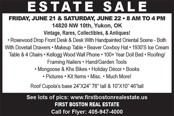 For a flyer or more information, contact First Boston Real Estate at 405-947-4000. Don't miss this opportunity to find incredible deals and unique items at our estate sale in Yukon, OK.