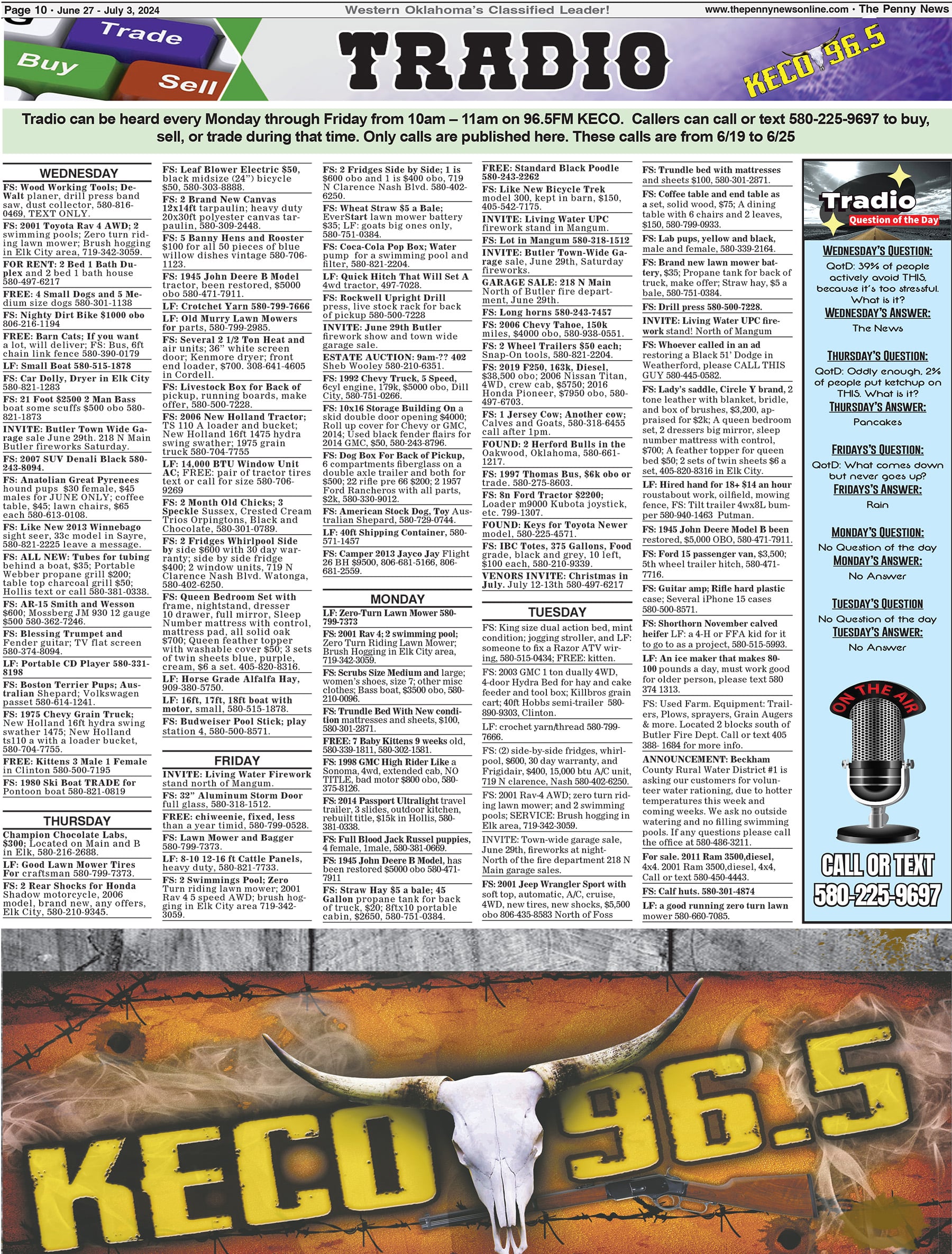 Call or text 580-225-9697 during show hours to buy, sell, or trade. Tune in to Tradio on 96.5FM KECO every Monday through Friday from 10am to 11am and become a part of our lively trading community. Don’t miss out on the great deals and opportunities that Tradio has to offer!