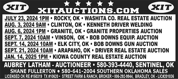 Contact Aubrey Latham at 580-393-4440 in Sentinel, OK, or Shane Fullerton at 580-641-2004 at Southern Oklahoma Sales for more information. XIT Auctions is licensed in OK RE #150319, TX #10620, and Bradley, OK, LIC#201036, by Street Farm & Ranch, Broker at 806-292-9944.