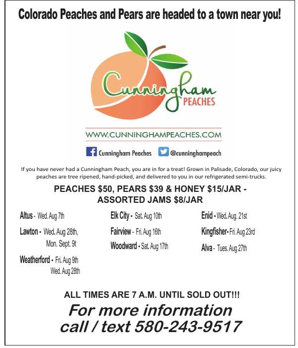 For more details about our upcoming visits and product offerings, feel free to call or text us at (580) 243-9517. We are happy to answer any questions you may have. Join us at one of our stops and experience the freshness of Cunningham Peaches. We look forward to seeing you soon!