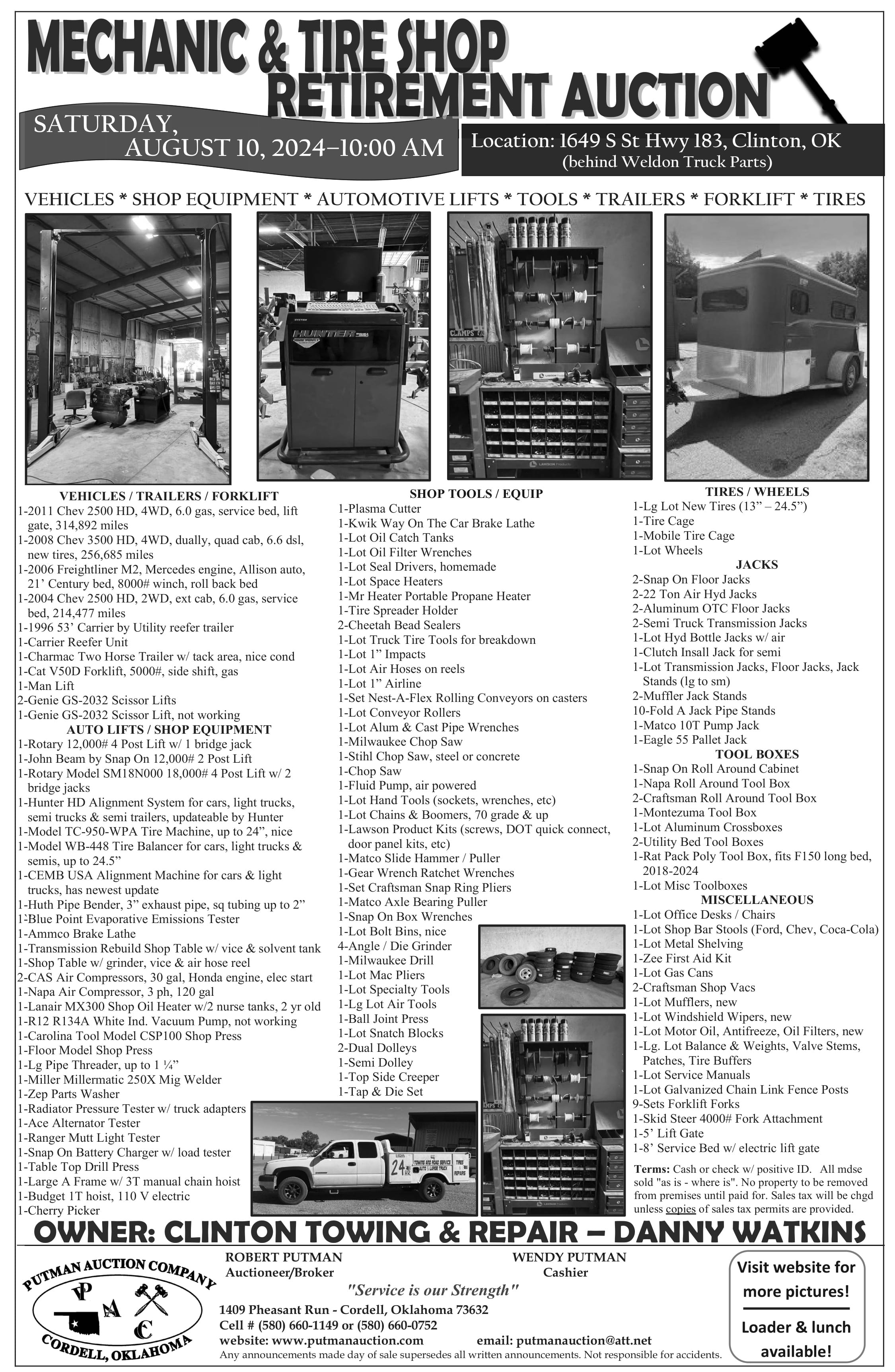 Auction in Clinton, OK! Join us on Saturday, August 10, 2024, at 10:00 AM for a fantastic auction featuring vehicles, shop equipment, automotive lifts, tools, trailers, forklifts, tires, and more. Highlights include a 2011 Chevy 2500 HD, 2008 Chevy 3500 HD, 2006 Freightliner M2, 2004 Chevy 2500 HD, and a 1996 53’ Carrier by Utility reefer trailer. We also have shop tools like plasma cutters, tire machines, air compressors, and much more. Visit our website for more details and pictures. Location: 1649 S St Hwy 183, Clinton, OK. Terms: Cash or check with positive ID. Don’t miss this event! Visit www.putmanauction.com for more information. Contact: Robert Putman at (580) 660-1149 or Wendy Putman at (580) 660-0752. Service is our strength!