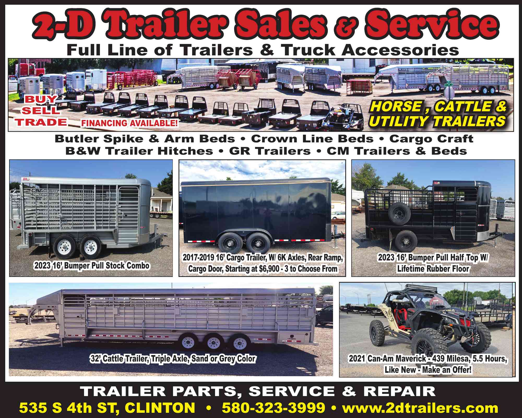 2-D Trailer Sales & Service in Clinton, Oklahoma, offers a comprehensive range of trailers, including horse, cattle, and utility trailers. With a full line of trailer parts, service, and repair, they cater to all your hauling needs. Featured products include 2023 16’ Bumper Pull Stock Combo trailers, 32’ Cattle Trailers, and pre-owned cargo trailers starting at $6,900. They also offer truck accessories and financing options. Visit their location at 535 S 4th St., Clinton, or explore their inventory online at www.2dtrailers.com.
