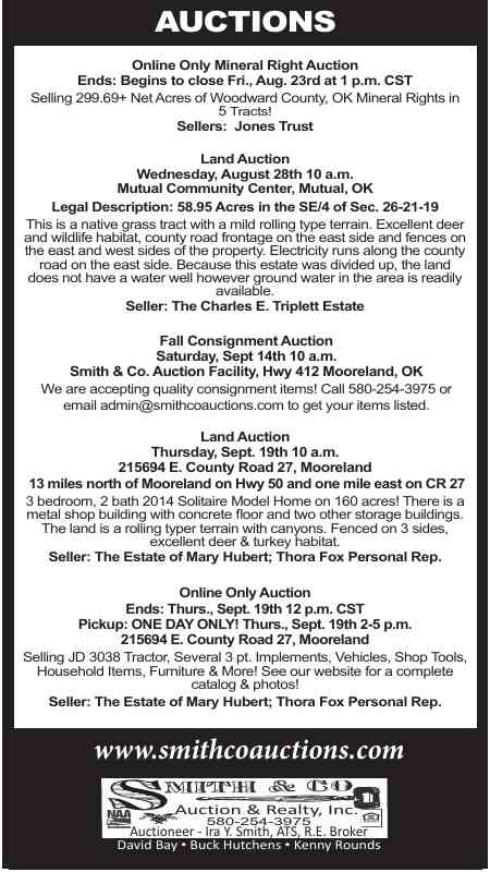 Smith & Co. Auction & Realty, Inc. is conducting an online-only mineral rights auction, closing on Friday, August 23rd at 1 p.m. CST. This auction features 299.69+ net acres of Woodward County, OK mineral rights, divided into five tracts. Don’t miss your chance to invest in these valuable properties.