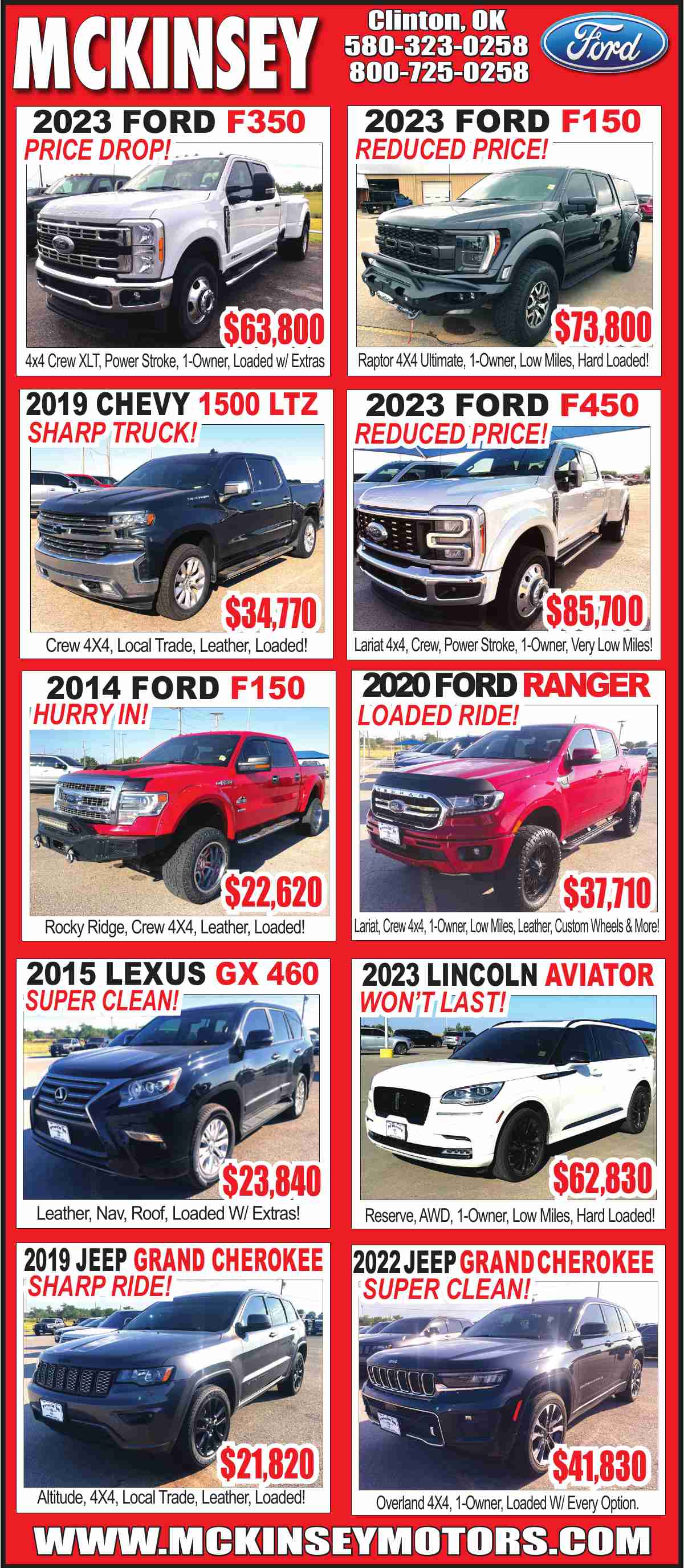 At McKinsey Ford Auto Sales in Clinton, Oklahoma, we take pride in offering a premium selection of pre-owned vehicles that meet the highest standards of quality and performance. Our inventory includes top models like the 2023 Ford F350 XLT Power Stroke, the luxurious 2015 Lexus GX 460, and the adventure-ready 2022 Jeep Grand Cherokee. Each vehicle is thoroughly inspected and loaded with extras, providing exceptional value for our customers.