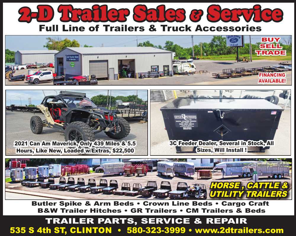 2D Trailer Sales & Service in Clinton, Oklahoma, offers a full line of trailers and truck accessories, specializing in horse, cattle, and utility trailers. They carry leading brands like B&W Trailer Hitches, CM Trailers, and Crown Line Beds. Their services include trailer parts, service, and repair, with financing available. As a 3C Feeder dealer, they stock various sizes with installation options. They also sell high-quality used vehicles like the 2021 Can Am Maverick, which comes loaded with extras. Whether you’re buying, selling, or trading, 2D Trailer Sales & Service is your trusted partner for all trailer needs.