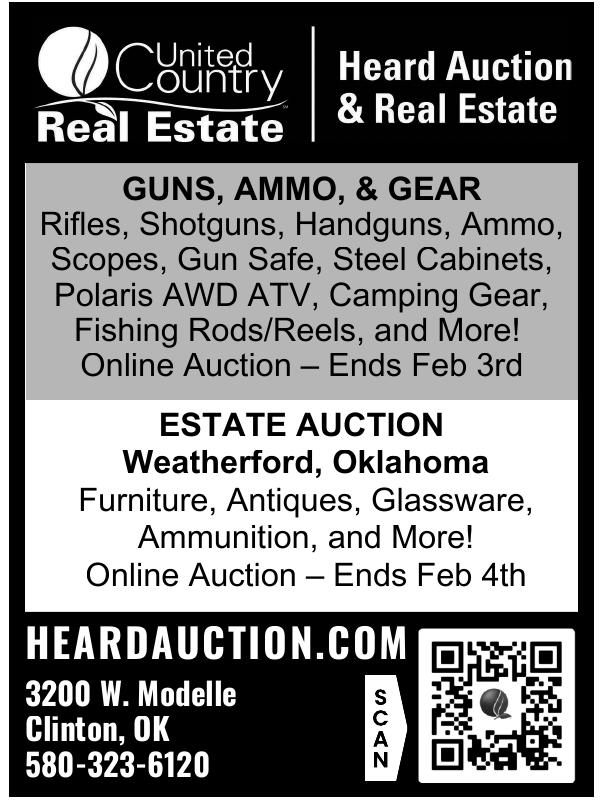 Heard Auction in Clinton, OK is hosting multiple exciting online auctions. The first auction features an impressive collection of guns, ammo, and gear, including rifles, shotguns, handguns, ammo, scopes, a gun safe, steel cabinets, a Polaris AWD ATV, camping gear, and fishing rods/reels. This auction ends on February 3rd. The second auction, an estate sale from Weatherford, OK, offers a variety of furniture, antiques, glassware, ammunition, and more. It ends on February 4th. For more information, visit HeardAuction.com or call 580-323-6120.