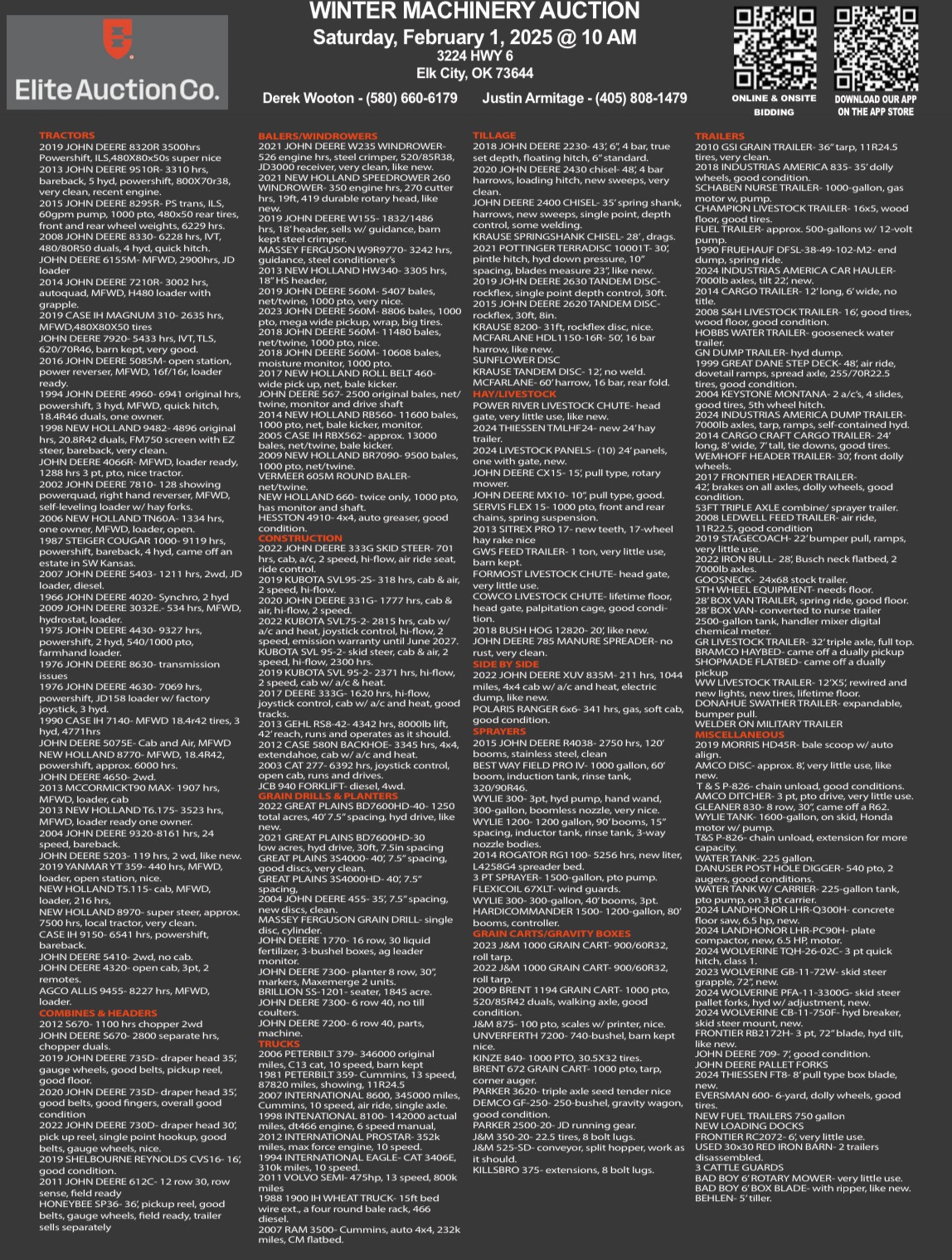 The Elite Auction Co winter machinery auction is on Saturday, February 1st at 10 am. 3224 HWY 6, Elk City OK. 73644. Call Derek Wooton (580)- 660-6179 or Justin Armitage (580) 808-1479 for information. Tractors, Combines & Headers, Balers & Windrowers, Construction Equipment, Grain Drills & Planters, Trucks, Tillage, Hay/Livestock Equipment, Side by Side, Sprayers, Grain Carts/ Gravity Boxes, Trailers, and lots of miscellaneous. Online and on-site bidding.