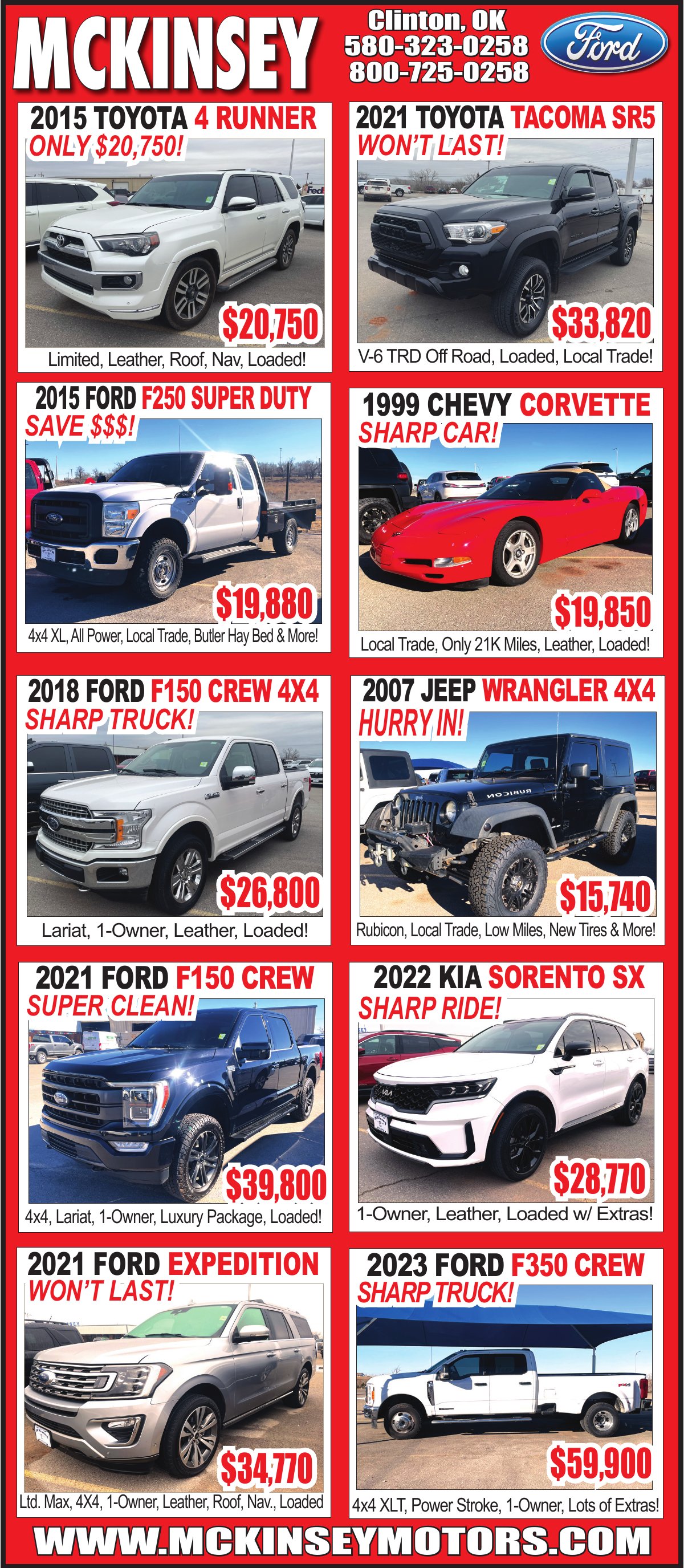 McKinsey Ford in Clinton, OK, offers an outstanding selection of high-quality pre-owned vehicles, including the 2021 Ford Expedition, 2021 Toyota Tacoma, and 2018 Ford F150. All vehicles are fully loaded, offering top-notch features like leather seating, navigation, and low mileage.