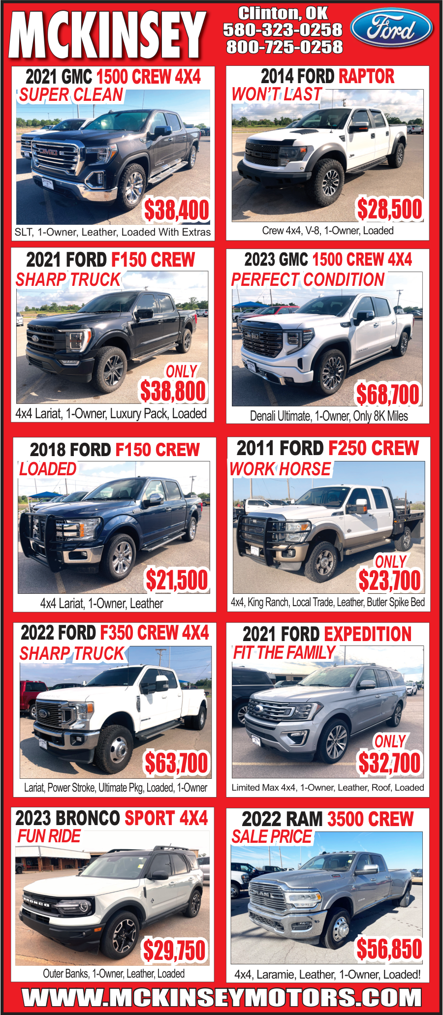 As a trusted name in Western Oklahoma, McKinsey Ford Auto Sales continues to deliver quality, transparency, and unbeatable prices. Visit their website or call for more information on these must-see deals.