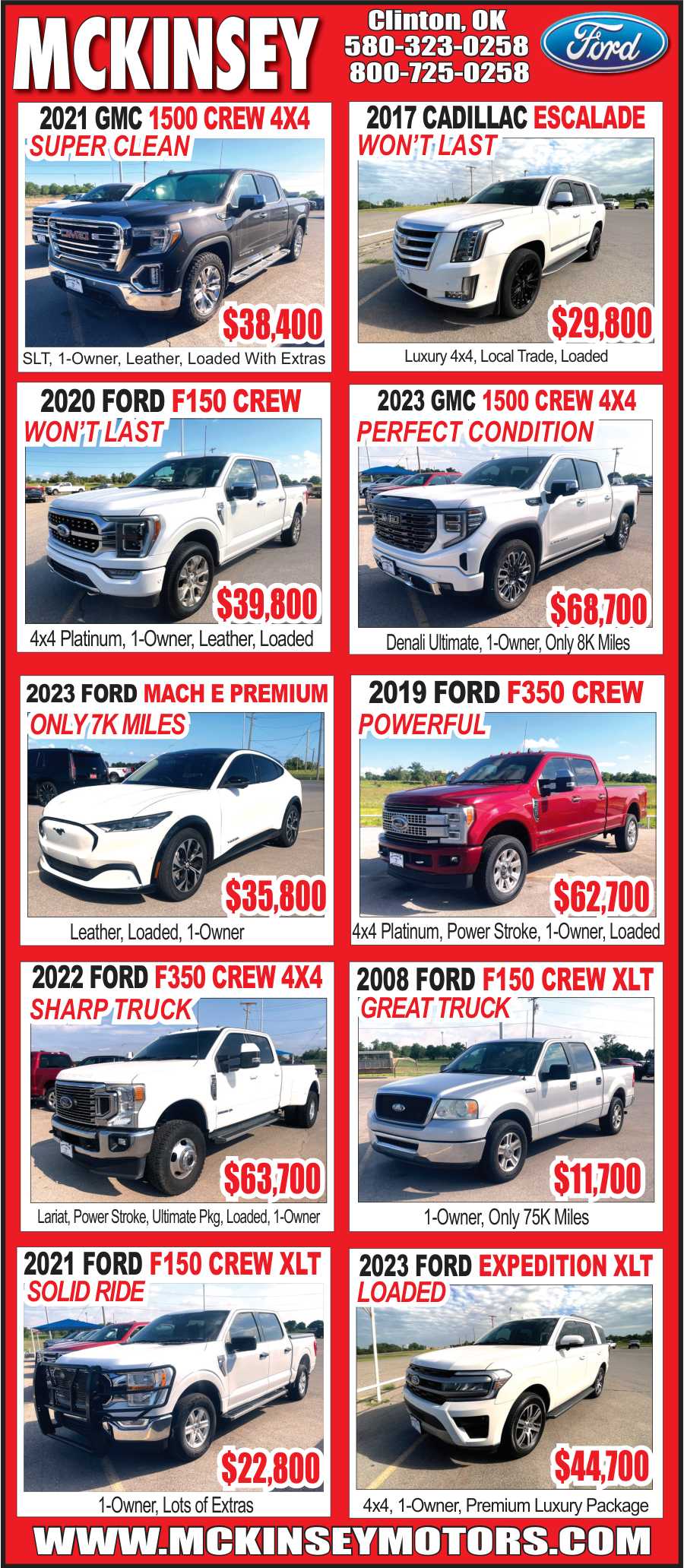 McKinsey Ford Auto Sales in Clinton, Oklahoma is offering a wide selection of high-quality, one-owner vehicles, each loaded with premium features. Their lineup includes trucks and SUVs like the 2022 Ford F350 Crew 4x4 with Power Stroke and Ultimate Package, a 2021 GMC 1500 Crew 4x4 with SLT trim, and a luxurious 2017 Cadillac Escalade. Also featured are newer models like the 2023 GMC 1500 Crew 4x4 Denali Ultimate and the 2023 Ford Expedition XLT. From powerful diesels to premium leather interiors and ultra-low mileage options, McKinsey Motors is ready to help you find your next vehicle. Visit www.mckinseymotors.com or call 580-323-0258 for more details.