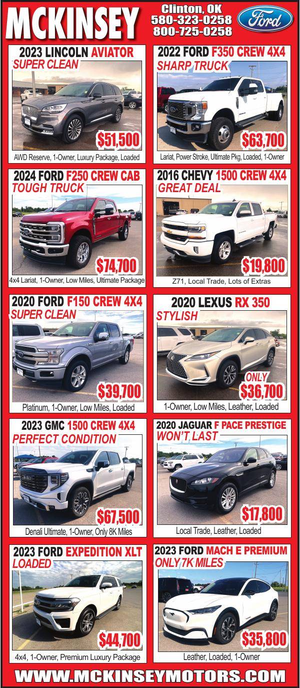 Shop premium pre-owned vehicles at McKinsey Motors in Clinton, Oklahoma! This week’s lineup features everything from heavy-duty trucks to luxury SUVs. Highlights include a 2024 Ford F250 Crew Cab 4x4 Lariat with the Ultimate Package for $74,700, a 2023 Ford Expedition XLT loaded with features for $44,700, and a 2023 GMC 1500 Denali Ultimate with just 8K miles at $67,500. Also available: a 2020 Jaguar F-Pace Prestige for $17,800 and a 2023 Ford Mach E Premium with only 7K miles for $35,800. Every vehicle is handpicked, most are one-owner and low mileage. Call 580-323-0258 or visit McKinseyMotors.com for full details.