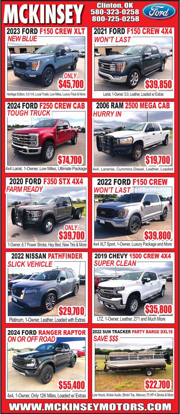 McKinsey Motors in Clinton, OK has an incredible lineup of used and new vehicles ready for you. Featured options include a 2024 Ford F250 Crew Cab Lariat with low miles and the ultimate package, a 2024 Ford Ranger Raptor built for on or off-road adventures, and a 2023 Ford F150 Crew XLT Heritage Edition loaded with luxury features. Affordable trucks and SUVs like a 2019 Chevy 1500 Crew 4x4, a 2020 Ford F350 STX 4x4, and a 2021 Ford F150 Crew 4x4 are also available. Don’t miss the 2006 Ram 2500 Mega Cab Laramie Cummins Diesel and even a 2022 Sun Tracker Party Barge DXL18 for lake days. With competitive pricing and local trade-ins, McKinsey Motors has something for every lifestyle.