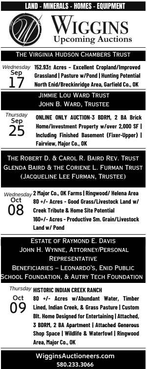 Wiggins Auctioneers presents a lineup of upcoming auctions featuring land, minerals, homes, and equipment across Oklahoma. Properties include excellent cropland and improved grassland with hunting potential in Garfield County, a fixer-upper 3-bedroom, 2-bath brick home in Fairview, and the historic Indian Creek Ranch in Major County, which boasts abundant water, timber, pasture, and a custom-built home designed for entertaining. Additional offerings include two Major County farms with livestock land, ponds, and home site potential. Visit WigginsAuctioneers.com or call 580-233-3066 for details.