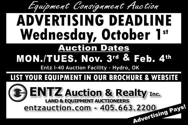 Entz Auction & Realty Inc. invites you to take part in their upcoming Equipment Consignment Auction at the Entz I-40 Auction Facility in Hydro, Oklahoma. The advertising deadline is set for Wednesday, October 1st, so now is the time to list your equipment in the official auction brochure and website. With auction dates scheduled for Monday and Tuesday, November 3rd & February 4th, this event is the perfect opportunity to reach buyers looking for quality land and equipment. Entz Auction reminds sellers that advertising pays and is key to getting your equipment noticed. For details, visit entzauction.com or call 405-663-2200.