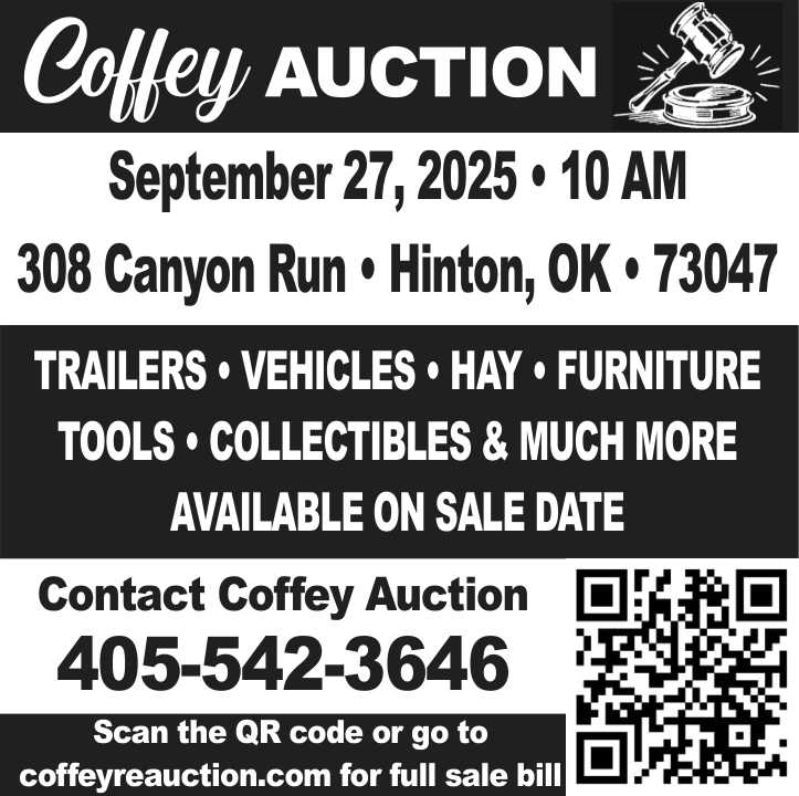 The sale begins at 10 AM on Saturday, September 27, 2025, at 308 Canyon Run, Hinton, OK. Arrive early to preview items and secure the best deals. Visit coffeyreauction.com for the full sale bill and additional auction information.