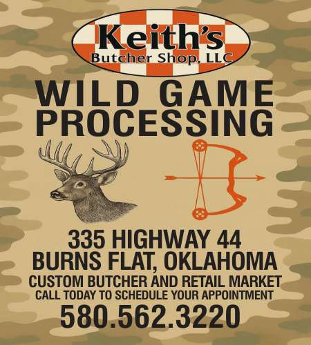 Located at 335 Highway 44 in Burns Flat, Keith’s Butcher Shop makes it simple to get your wild game and custom orders processed. Customers can schedule an appointment by calling 580-562-3220, ensuring quick and efficient service.
