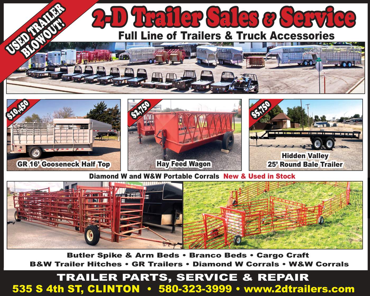 Stop by 535 S 4th St, Clinton, OK, call 580-323-3999, or visit www.2dtrailers.com to check current inventory, get pricing, or schedule service.