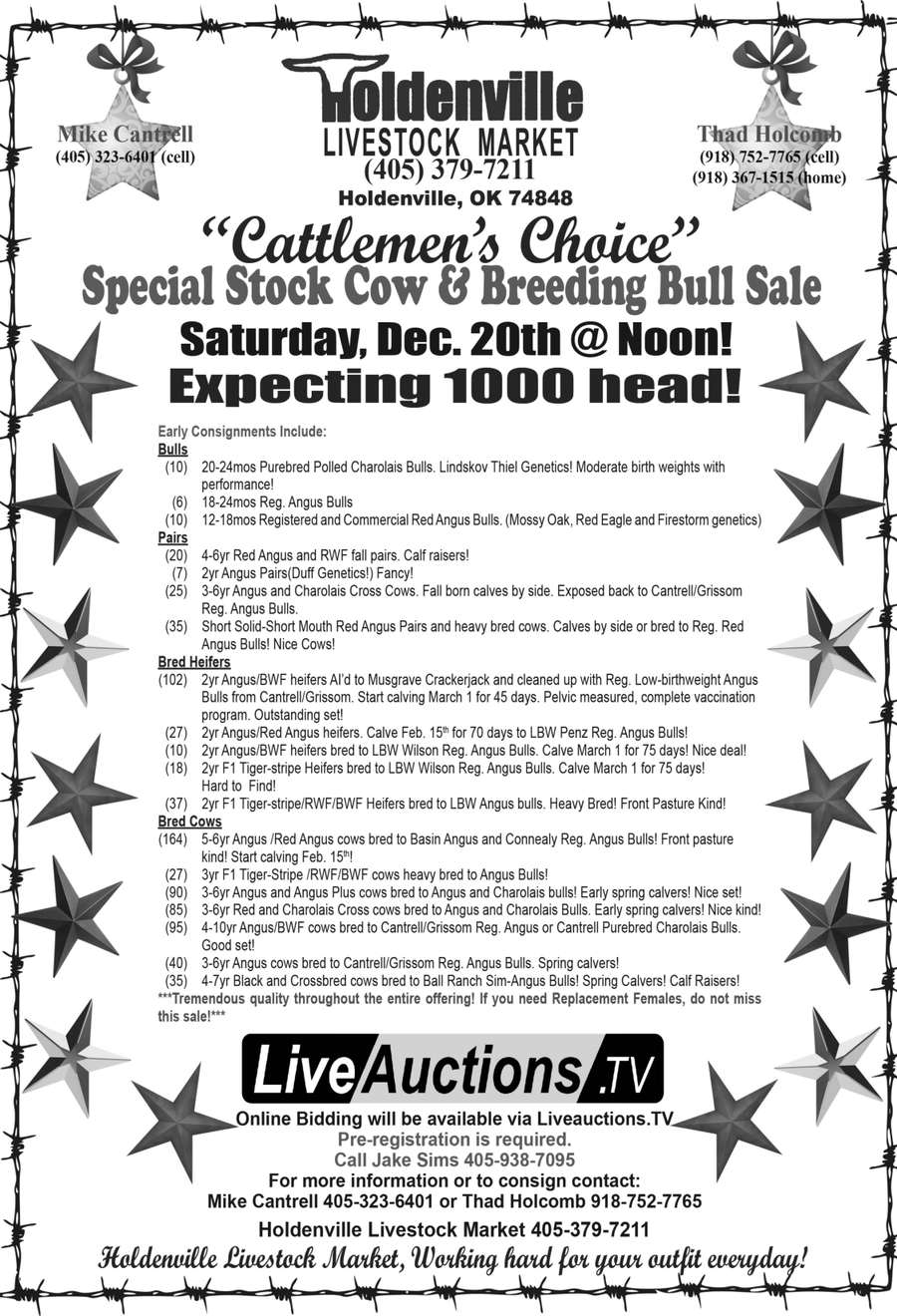 For more information or to consign, contact the sale team at Holdenville Livestock Market. Call the market office at (405) 379-7211, Mike Cantrell at (405) 323-6401, or Thad Holcomb at (918) 752-7765.