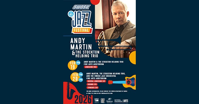 Festival events begin Thursday, Feb. 19, with a free public concert at 7 p.m. in the SWOSU Fine Arts Center Auditorium. Trombonist Andy Martin will be joined by the Stockton Helbing Trio for an evening of small-group jazz. A kickback will follow at 9 p.m. at the Best Western Plus Lobby Lounge, providing an informal space for conversation after the concert. Snacks will be provided by the SWOSU Music Department.