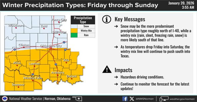 According to the National Weather Service in Norman, much of Oklahoma could see accumulating snow from Friday through Sunday. Snow chances are highest roughly north of Interstate 40, though a wintry mix of rain, sleet and freezing rain could push south as temperatures drop Friday into Saturday. A light glaze of ice remains possible across portions of central and southern Oklahoma as well.