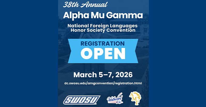 Weatherford, OK — Registration is available for the 38th National Convention of Alpha Mu Gamma, the National Collegiate Languages Honor Society, with the event scheduled for March 5–7 at Southwestern Oklahoma State University (SWOSU). The convention will be held in the Memorial Student Center in Weatherford and will bring together students, faculty, and language scholars from across the United States and abroad to share research and ideas.