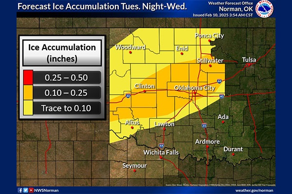A winter storm is set to sweep across Western Oklahoma, bringing a mix of snow, sleet, and freezing rain over the next 24 hours. The most significant impacts are expected Tuesday night into Wednesday morning, with meteorologists warning of treacherous road conditions, possible power outages, and school closures.