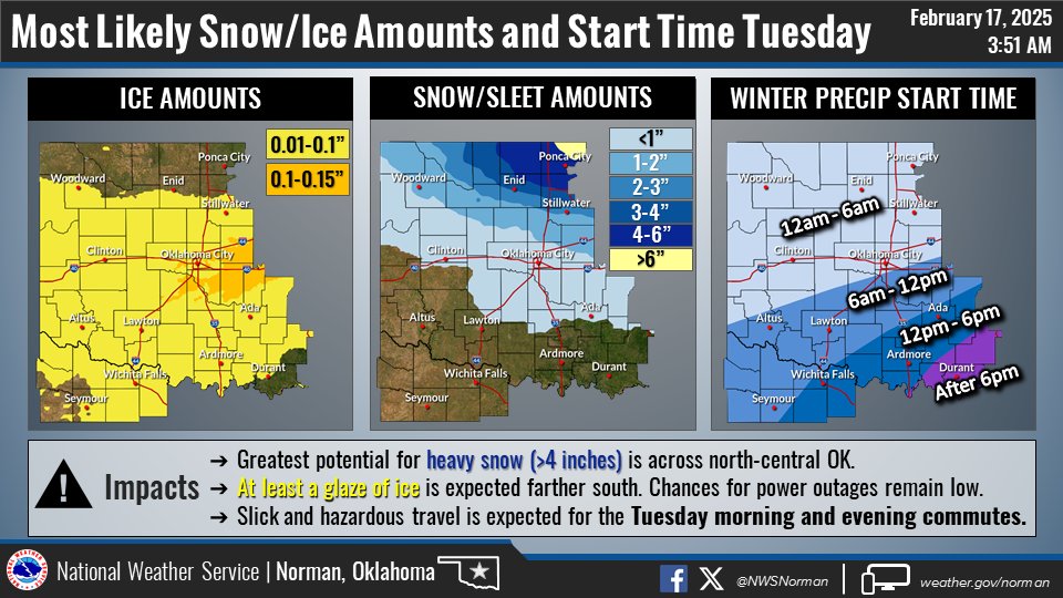 Western Oklahoma will see a mix of snow, sleet, and freezing rain, with the heaviest accumulations expected north of I-40. Areas like Elk City, Clinton, and Weatherford could see 1-3 inches of snow, while towns farther north, including Cheyenne and Leedey, could receive 3-4 inches. Ice accumulations up to 0.15 inches are possible, making roads slick and hazardous.