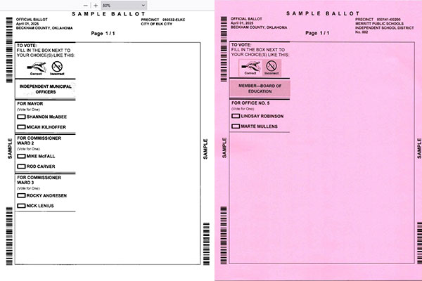 Sample ballots are now available for the April 1st Election. Voters can download a sample ballot using the State Election Board OK Voter Portal at oklahoma.gov/elections/ovp or pick up a copy at the Beckham County Election Board during normal business hours.