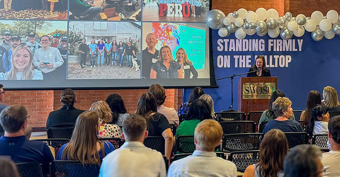 The Dobby Awards ceremony was planned and hosted by Dr. Jonna Myers and students in her Professional Development course. The event celebrates academic achievement and provides support for students pursuing degrees in business, technology, and related fields. Students were honored for their performance in undergraduate and graduate programs, and scholarships were awarded through the SWOSU Foundation, thanks to the generosity of donors and supporters.
