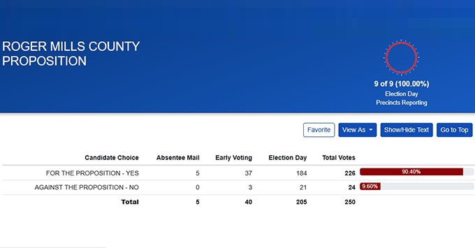 Roger Mills County, OK – Voters in Roger Mills County have approved a six-year extension of a 1.5% county sales tax, with 90.4% voting in favor during Tuesday’s special election. The proposition passed with 226 votes for and only 24 against, according to the official results from all 9 precincts reporting.