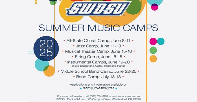 Weatherford, OK – The Department of Music at Southwestern Oklahoma State University (SWOSU) invites middle- and high-school musicians to register for the 70th summer of SWOSU Music Camps hosted in Weatherford. The 2025 Music Camp offerings include the following: