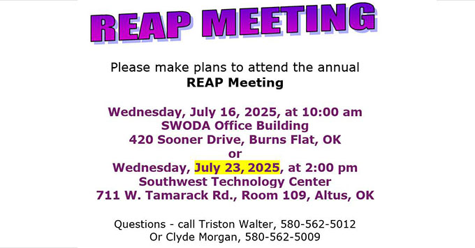 Burns Flat, OK – Entities in Southwest Oklahoma are urged to attend one of the upcoming REAP (Rural Economic Action Plan) meetings hosted by SWODA (South Western Oklahoma Development Authority). These meetings are key for communities seeking funding assistance for rural infrastructure and economic development projects.