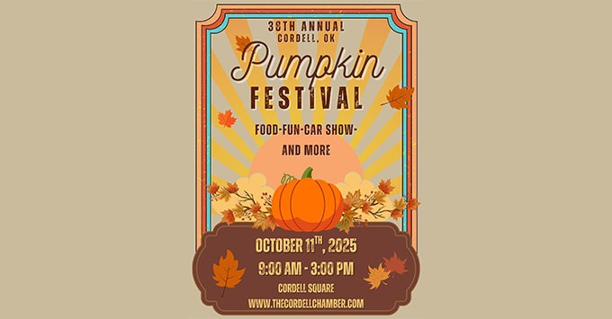 Cordell, OK – Cordell’s downtown square will come alive on Saturday, October 11, as the Cordell Chamber of Commerce hosts the 38th Annual Pumpkin Festival & Car Show. Events run from 9 a.m. to 3 p.m. in Historic Downtown Cordell, with a full day of food, shopping, entertainment, and family fun.