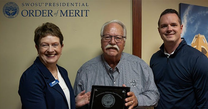 Weatherford, OK – Southwestern Oklahoma State University (SWOSU) proudly recognized longtime benefactor and SWOSU Alumni Association Past President Mike Wilkes, '75, with the prestigious Presidential Order of Merit. The award was presented by SWOSU's Acting President, Dr. Janet Cunningham, during the SWOSU Alumni Association Board of Directors meeting on Friday, October 24, 2025, prior to the kickoff of this year's SWOSU Homecoming festivities.