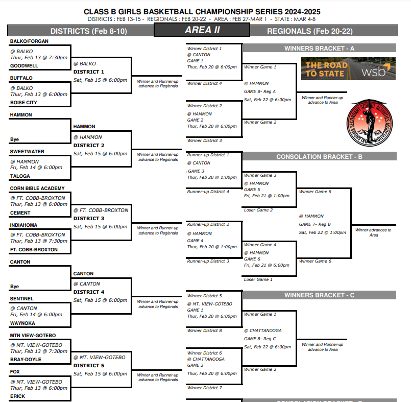 Class 2A-A-and B high school basketball playoff brackets were released this afternoon. In 2A Area II, both Merritt squads will get the playoffs started by hosting District on next Friday night. Both teams will play the winner of Thursday’s games between Cordell and Frederick. In Class A Area IV, both AB teams will play in Canute next Thursday in elimination games against Shattuck. Canute will get the winner’s of those games next Friday. The C-R Bears will play an elimination game in Okeene next Friday against Okeene. The Lady Bears won’t play til next Saturday night in Okeen against the Okeene/SW Covenant winner. Class B Area I has both Leedey teams. They’ll play the Aline-Cleo/Kremlin-Hillsdale winners next Saturday at Leedey. In Class B Area II, both Erick teams are in 4 team districts. The Lady Bearcats will play an elimination game next Thursday against Fox. The Bearcats will play an elimination game next Friday vs Fox. The Erick games will be played at Mt.View-Gotebo. Hammon’s a district host. Both teams will play next Saturday against the Sweetwater/Taloga winners.