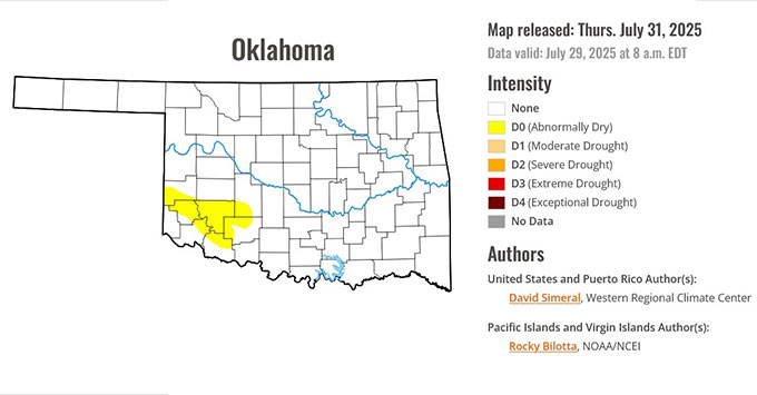 Southwest Oklahoma is beginning to see signs of drought re-emerging, according to the latest map released Thursday, July 31, 2025, by the U.S. Drought Monitor. The data, valid as of July 29, shows a growing pocket of "Abnormally Dry" conditions—designated as D0—taking shape across parts of the region.