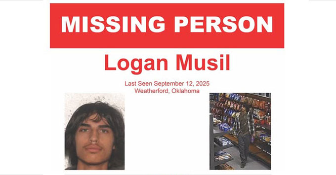 Weatherford, OK – The Southwestern Oklahoma State University Campus Police Department is asking for the public’s help in locating Logan Musil, an 18-year-old SWOSU student who has been missing since September 12, 2025.